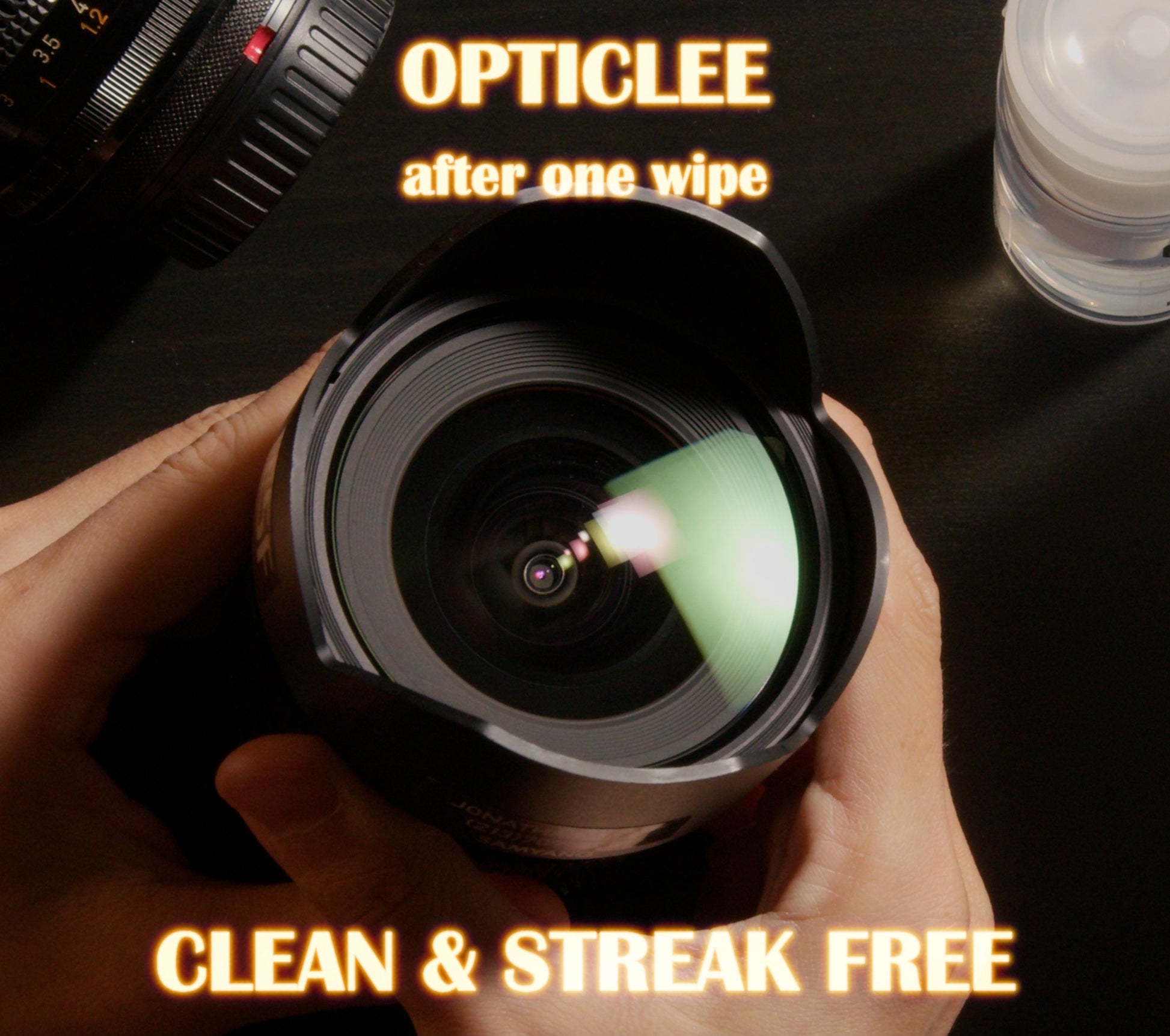 Experimenting with different combination and ratio of chemicals that contain specific properties that help with cleaning a variety of contamination on coated lenses, Jonathan came up with the perfect blend of solution for cleaning glass lens elements. A combination of acetone, isopropyl alcohol, detergent and more under a very specific ratio, this solution is gentle on the lens while effectively cleaning surface contamination, all while drying fast and leaving no streaks. Additionally, he purposefully avoided using harsh chemicals such as methanol to make the solution safe for everyday, external use.